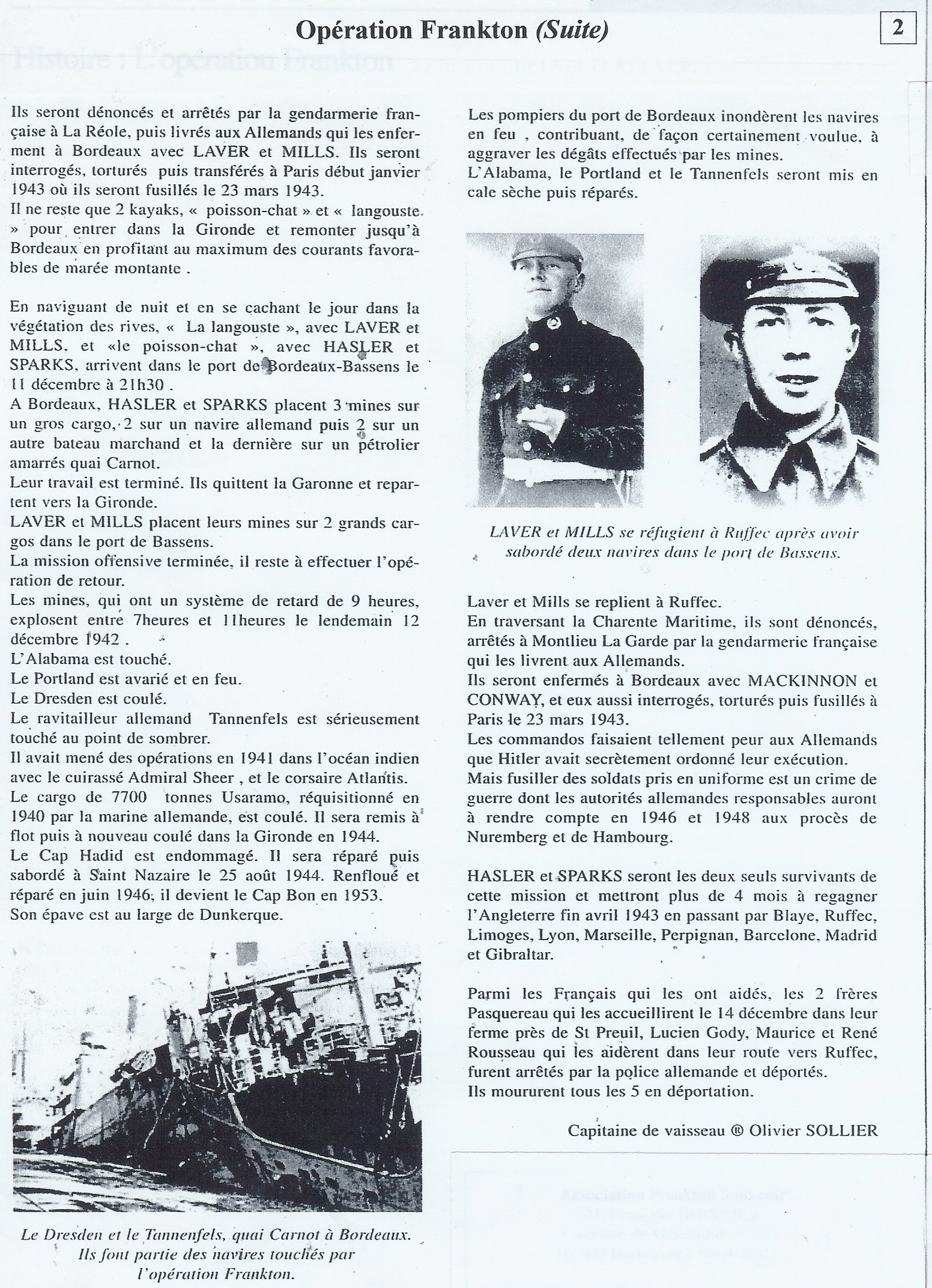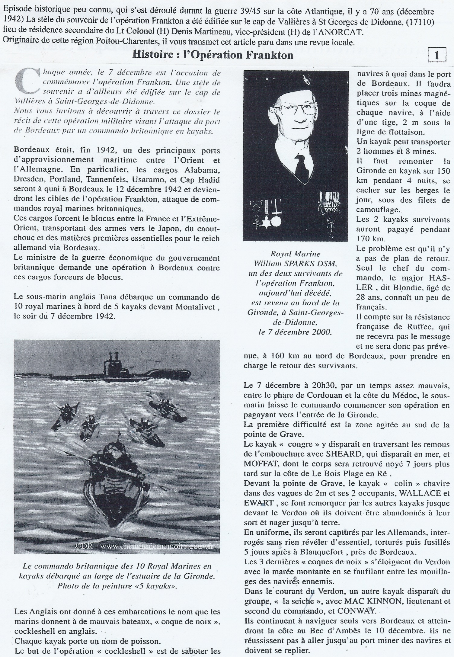 La stèle du souvenir de l’opération Frankton a été édifiée sur le cap de Vallières à St Georges de Didonne, (17110) lieu de résidence secondaire du Lt Colonel (H) Denis Martineau, vice-président (H) de l’ANORCAT.